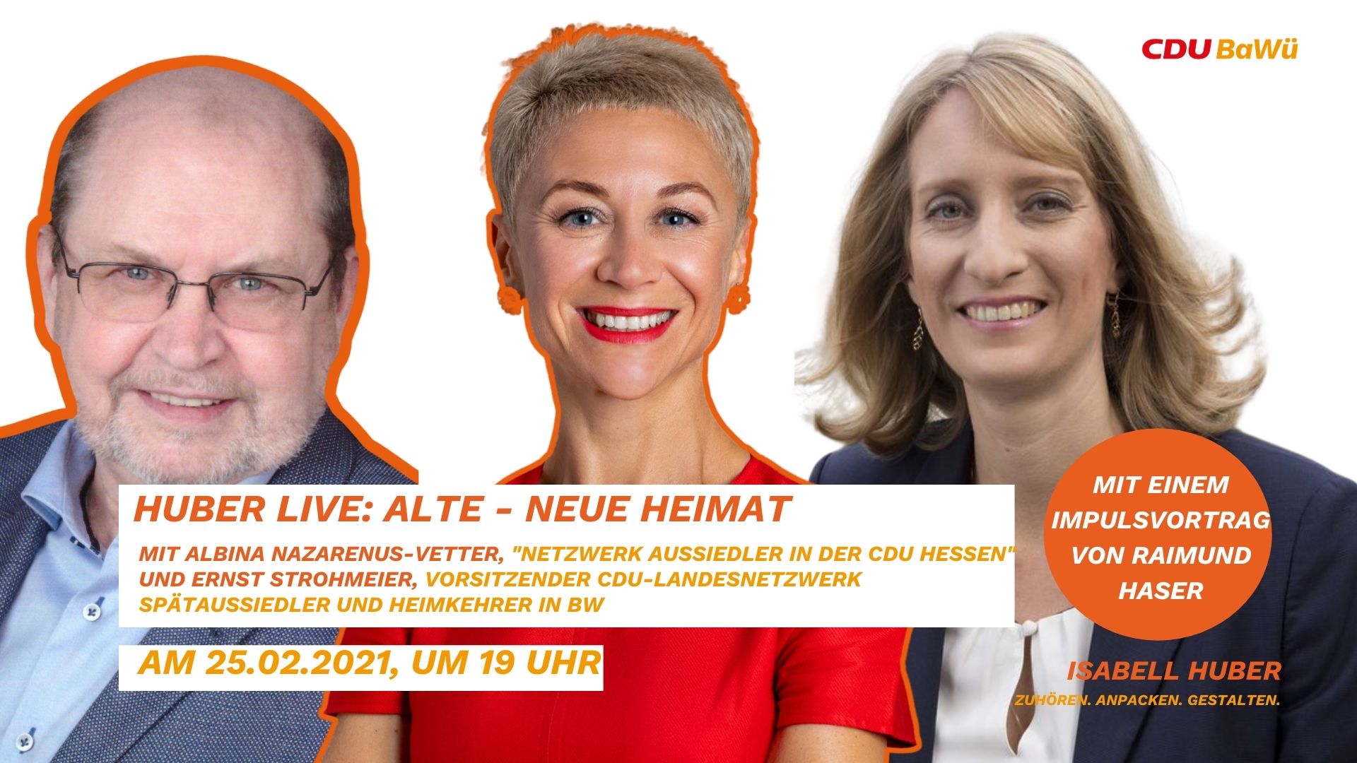 CDU-Kreisgeschäftsstelle HeilbronnIsabell Huber MdL lädt zu einer Online-Gesprächsrunde mit Albina Nazarenus-Vetter vom "Netzwerk Aussiedler in der CDU Hessen" (UdV) und Ernst Strohmaier, Vorsitzender des CDU-Landesnetzwerkes Spätaussiedler und Heimkehrer in Baden-Württemberg ein. Gemeinsam tauschen wir uns am 25.02.2021 um 19:00 Uhr über die neue und alte Heimat, die unterschiedlichen Erfahrungen und Themen, die bewegen, aus. Raimund Haser, Beauftragter für […]