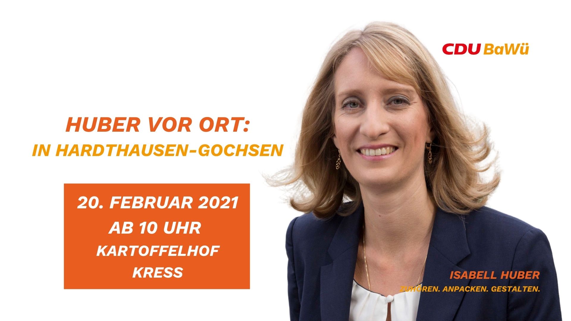 Am Samstag von 10 Uhr – 12 Uhr werde ich in Hardthausen mit einem Corona konformen Infostand auf dem Kartoffelhof Kreß in Gochsen vor Ort sein. Ich freue mich direkt mit Ihnen ins Gespräch zu kommen, natürlich unter den gegebenen Hygiene- und Abstandsregeln.